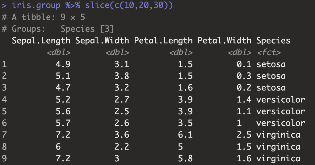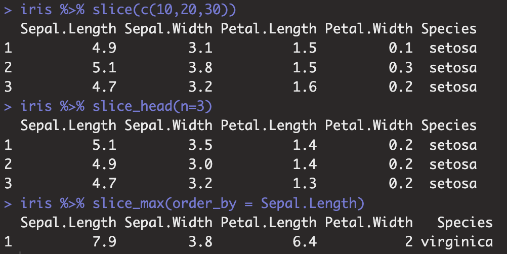( slice()를 사용하면 행을 (정수) 위치별로 인덱싱할 수 있습니다. 행을 선택, 제거 및 복제할 수 있습니다. 일반적인 사용 사례에 대한 여러 도움말이 함께 제공됩니다 )