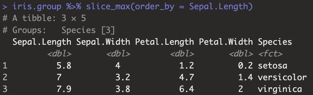 iris.group %>% slice_max(order_by = Sepal.Length)