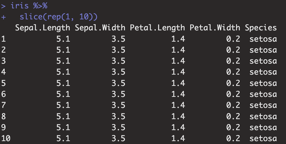 iris %>% slice(rep(1, 10))