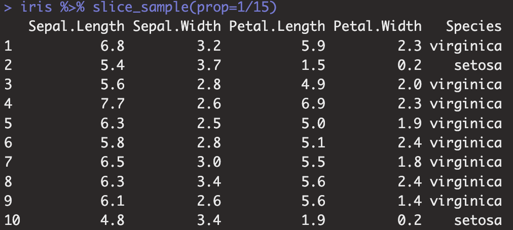 마지막으로 행을 무작위적으로 선택하기는 n(횟수), prop(비율) 인자를 통해 다음과 같이 구현할 수 있습니다.