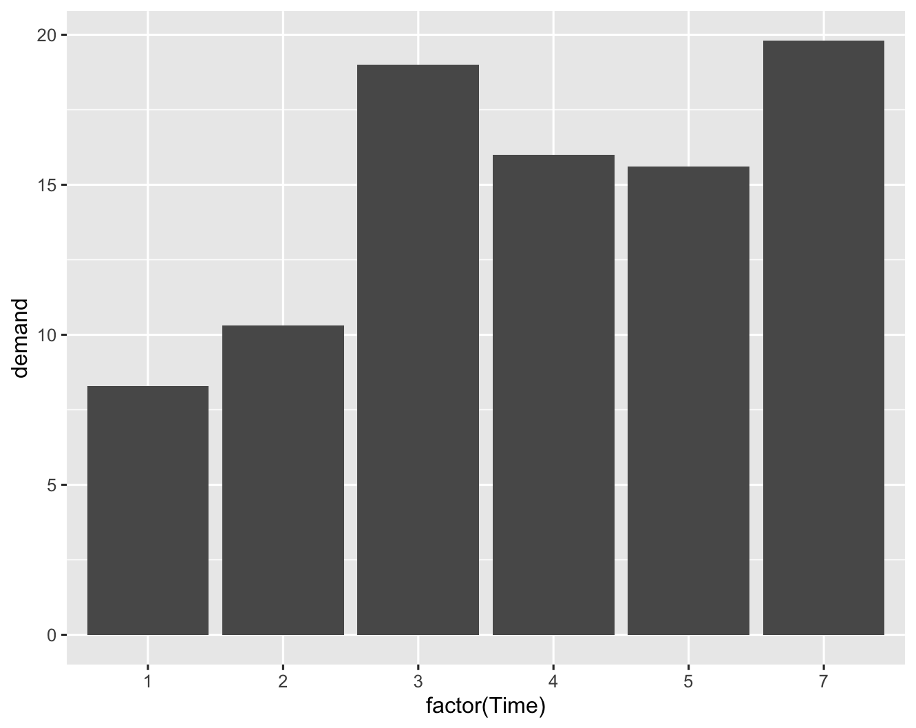 BOD %>% ggplot(mapping=aes(x=factor(Time), y=demand)) + geom_col()