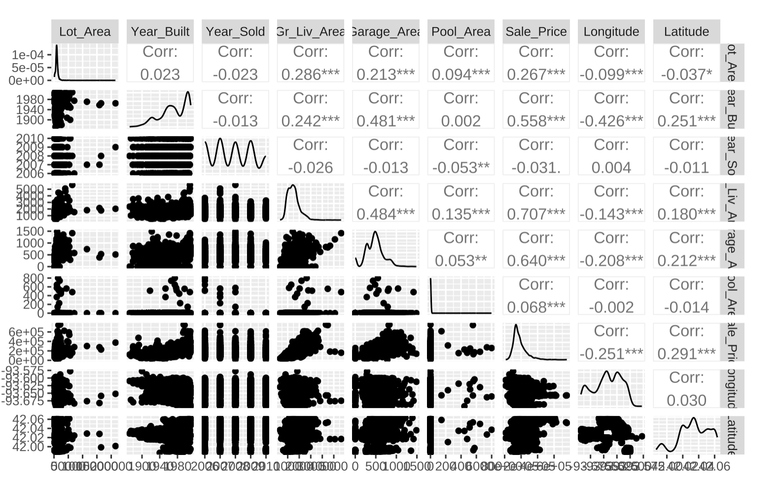 반응변수인 `Sale_Price`는 `Garage_Area`(차고면적), `Gr_Liv_Area`(거주면적), `Year_Bulit`(건축연도)와 뚜렷한 양의 상관관계를 보이고 있습니다.