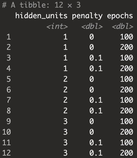 - grid : data frame of tuning combinations(grid_* 함수도 가능) 또는 positive integer